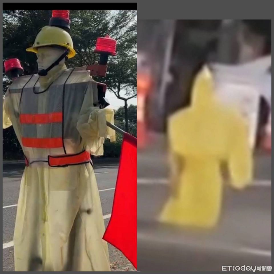 ▲雨衣阿飄半夜路上逛大街(右)真相大白,警方判斷是工地的電動旗手被吹上路。(圖/記者唐詠絮翻攝)