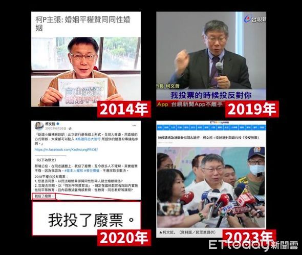 不過,政治人物的公開發言,凡走過必留下痕跡,柯文哲過去與現在針對同婚議題的發言,7日在網路上就被翻出了四張截圖畫面,內容分別是:2014年柯文哲競選市長時高舉「自由戀愛、婚姻平權」的手舉版,並在當時競選官網「柯P新政」上表明支持同性婚姻;第二張則是2019年同婚後,柯文哲訪美演講時說:「同志的題目,在這次台北的公投沒過,我投票的時候投反對你,可是我允許12萬5千人上街遊行。」第三段畫面則是2020年時,柯文哲在臉書上表示「在同志議題上,我投了廢票」。