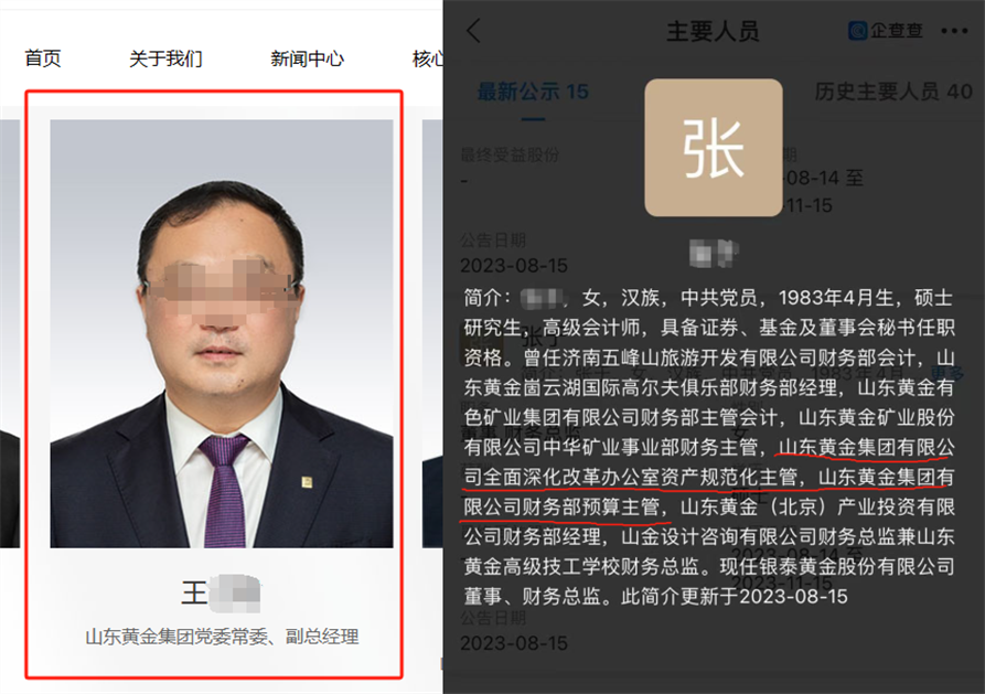 山東黃金集團有限公司官網顯示,網友所舉報的王男為該公司黨委常委、副總經理。公開資料顯示,2022年,山東黃金與銀泰黃金控股股東及實控人簽訂協議,收購銀泰黃金20.93%股份,以取得其控制權。2023年8月15日,據《證券時報》報導,銀泰黃金股份有限公司發布公告,公司第八屆董事會聘任張女為公司財務總監。