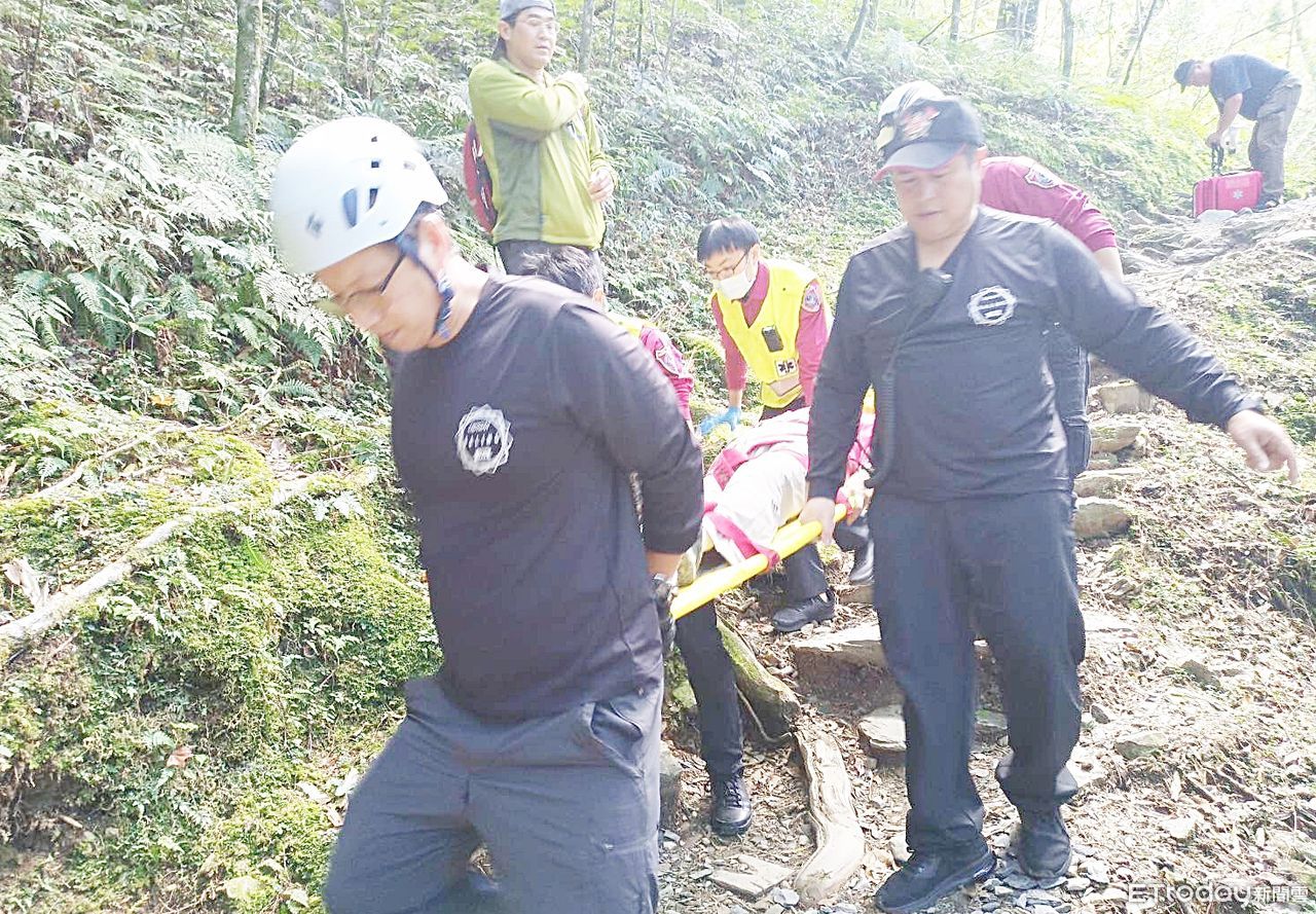 ▲桃園市復興區巴陵分隊人員從拉拉山巨木群將受傷林姓婦人以輪式擔架運送下山送醫治療。(圖/記者沈繼昌翻攝)