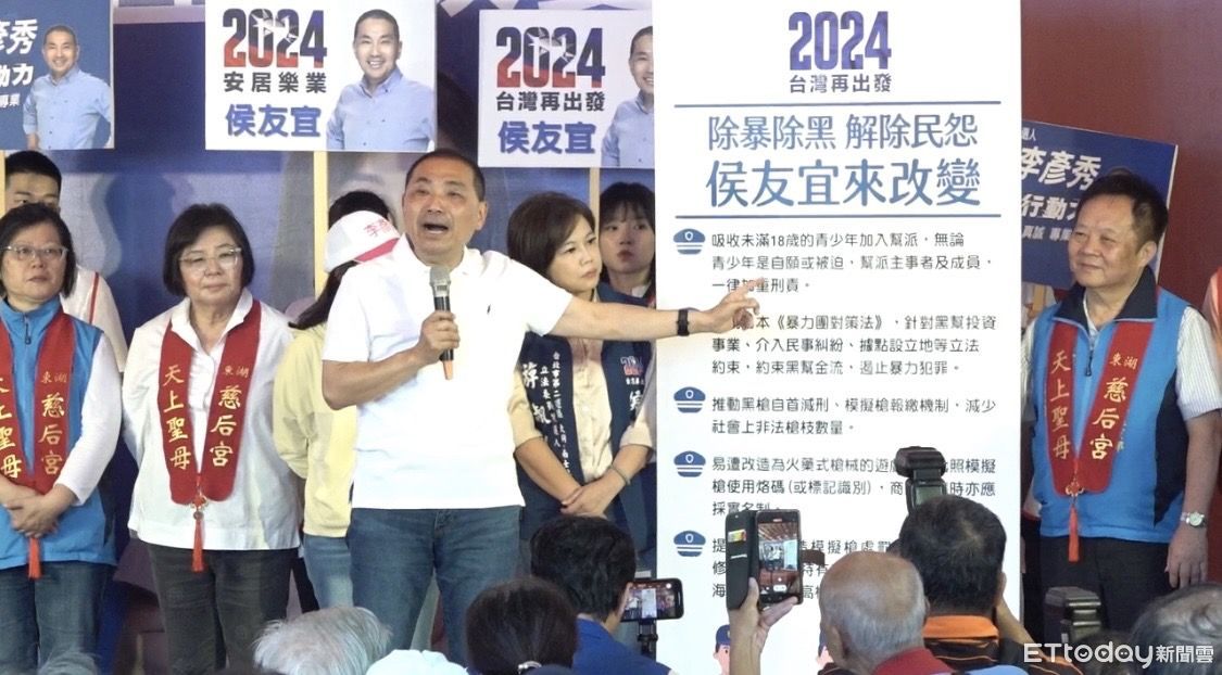 國民黨總統參選人侯友宜今(10)日與立委參選人李彥秀、游淑慧前往東湖慈后宮參拜,並發布治安政策。侯友宜指出,他將遏止青年加入黑幫,同時借鏡日本的《暴力團對策法》將立法約束黑幫金流,另也會推動黑槍自首減刑及模擬槍報繳、增加大部分類真槍且大部分金屬製的遊戲槍烙碼、加重模擬槍處罰,目標達到「生活安全、社會安定、人民安心」,未來維護治安是重要施政項目。