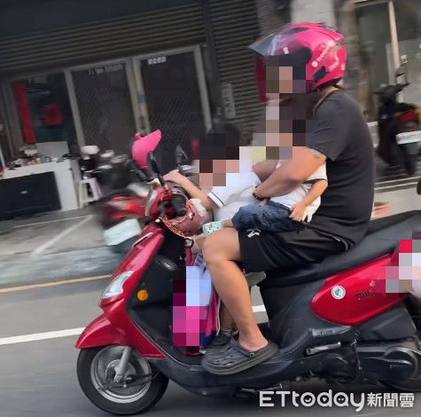 ▲有網友在網路社群平臺po文,傳出1段影片,畫面中1名男子騎機車載2名孩童,騎士3貼並單手騎車,警方將依法傳喚對方到場依法告發勸誡,並依兒少法通報施關懷訪視。(圖/翻攝自臉書台南大小事,下同)