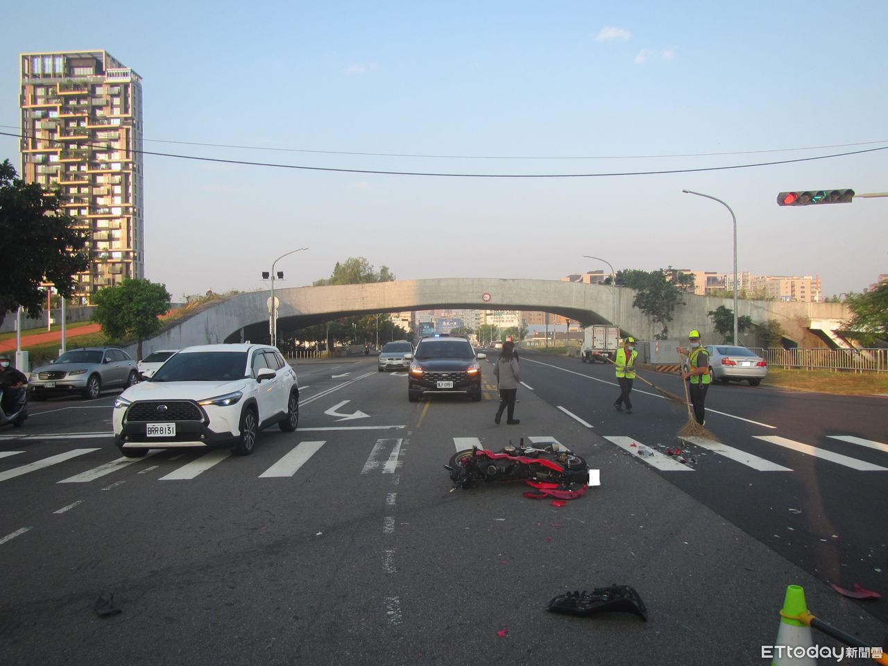 肇因初步研判,機車未依兩段式左轉,自小客車闖紅燈直行,全案仍送交交通大隊釐清事發經過。