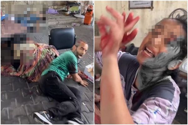 ▲網傳影片中,希法醫院門診區地上倒著許多重傷者,民眾試圖為他們止血。(圖/翻攝自X)