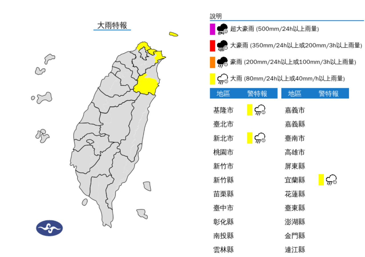大雨:基隆北海岸、宜蘭縣山區