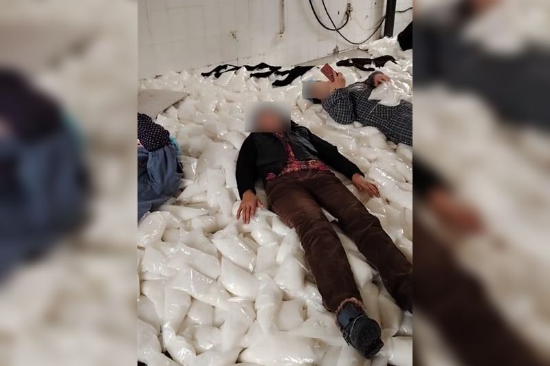 ▲食品廠員工將原料當成床墊,躺在上面睡覺。(圖/翻攝微博)
