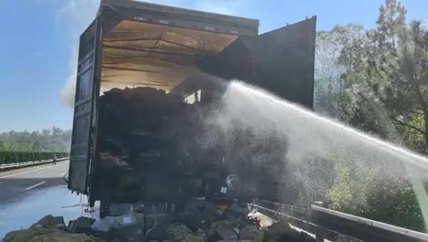 通報指出,火災起因於貨車行駛過程中,後方輪胎溫度過高導致爆炸;事發時,駕駛員迅速發現問題並及時停車,嘗試使用4個滅火器和車上水源進行初期撲救,但火勢迅速蔓延,無法控制。