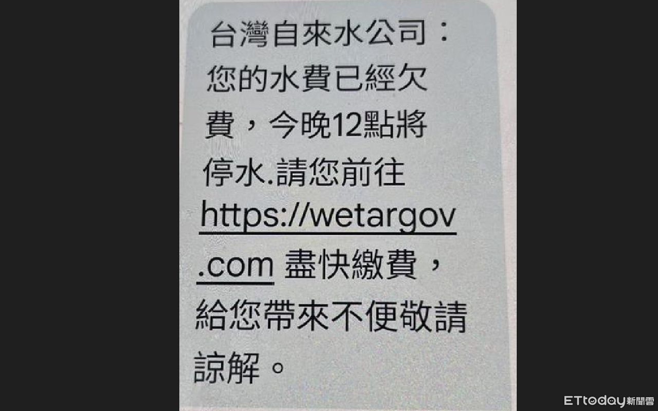 ▲簡訊狂收「欠水費,午夜12點停水」,台水提醒:詐騙勿點。(圖/台水提供)