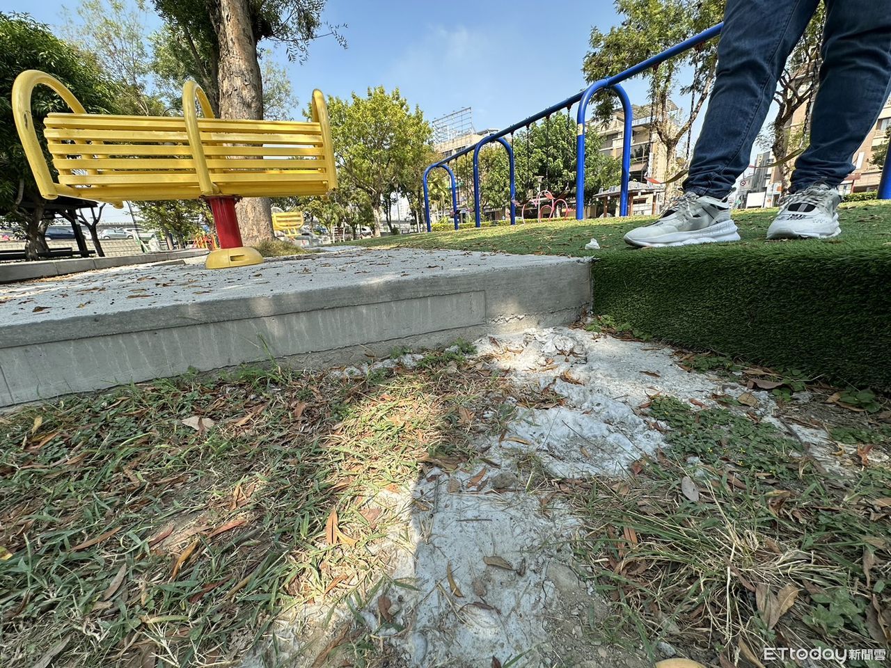 ▲台中十九甲健康公園遊戲區跟一般草地路面竟落差22公分。(圖/市議員江和樹提供)