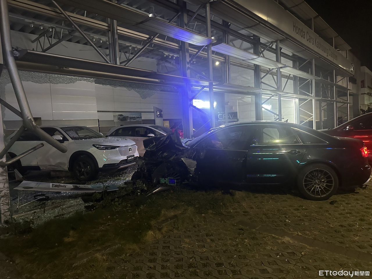 高雄林姓男子今(15日)凌晨開著一輛白色海神休旅車上路,但行經一處路口時卻疑似為了搶快而闖紅燈,當場與一輛綠燈直行的黑色奧迪發生碰撞,造成奧迪失控衝進路旁的本田汽車展示中心,奧迪駕駛因此受傷送醫,所幸並無大礙。