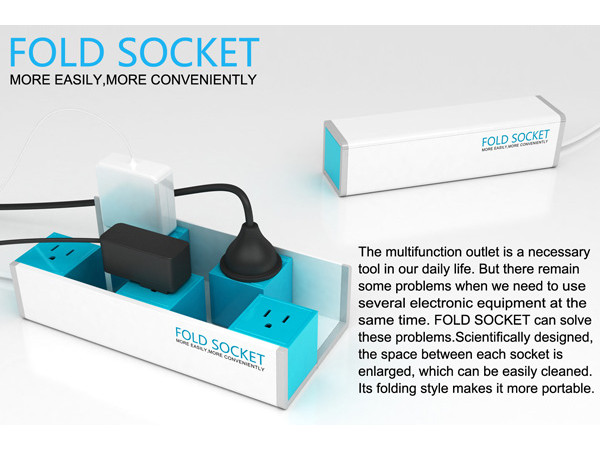 現在生活會越來越進步,是因為人們從很多小地方去發想,並且改善生活品質;電器用品在我們的生活上佔了很多的時間,所以充電設備都是必要的設施,手機需要充電,如果還有外出攜帶方便的行動電源,也需要充電,每樣電器都要插電,插座設計卻容不下這麼多插頭,Fold Socket讓人完全沒有這種煩惱。