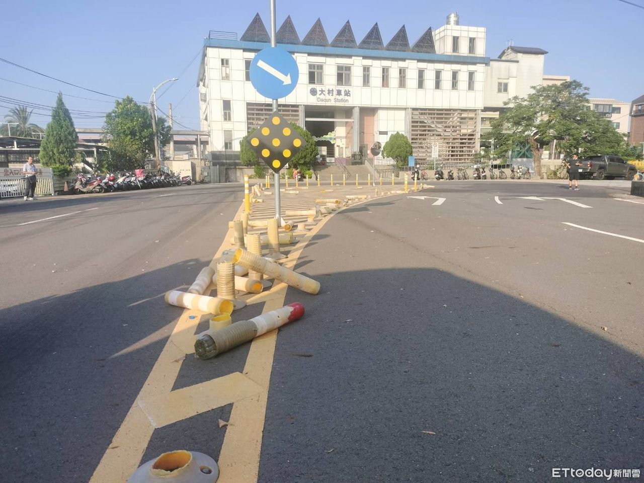 ▲彰化大村車站前防撞桿被踢倒。(圖/記者唐詠絮翻攝)
