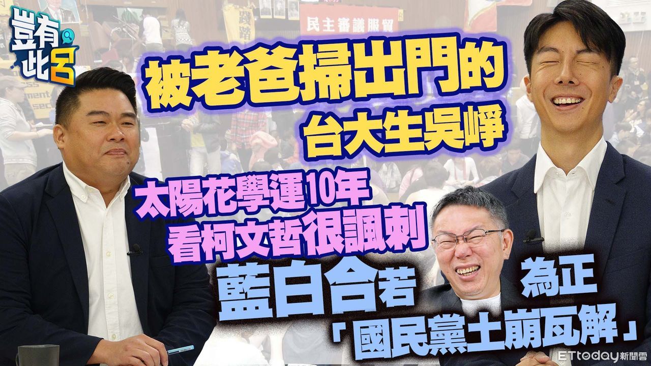 太陽花學運10年,當時擔任發言人工作的要角吳崢來了!被主持人呂捷問到當時到場聲援的柯文哲,今昔是否有不同?吳崢指出,柯文哲應該不會否認他曾搭到太陽花的順風車,但如今他在這一些事的立場轉變「很諷刺」。而藍白合昨天談好比民調,吳崢直言,若最後柯文哲為正,國民黨土崩瓦解也是分分秒的事。