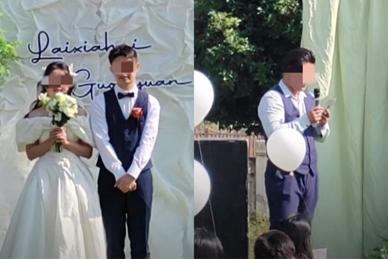 據《熱點新聞》報導,影片中可見新娘穿著白色的禮服,在陽光灑落下拿著捧花與新郎靦腆地笑著,搭配草地及眾人的祝福下看起來格外地幸福。不過畫面一轉到新娘另一旁的司儀再對比新郎,服裝上幾乎可說是同一套。
