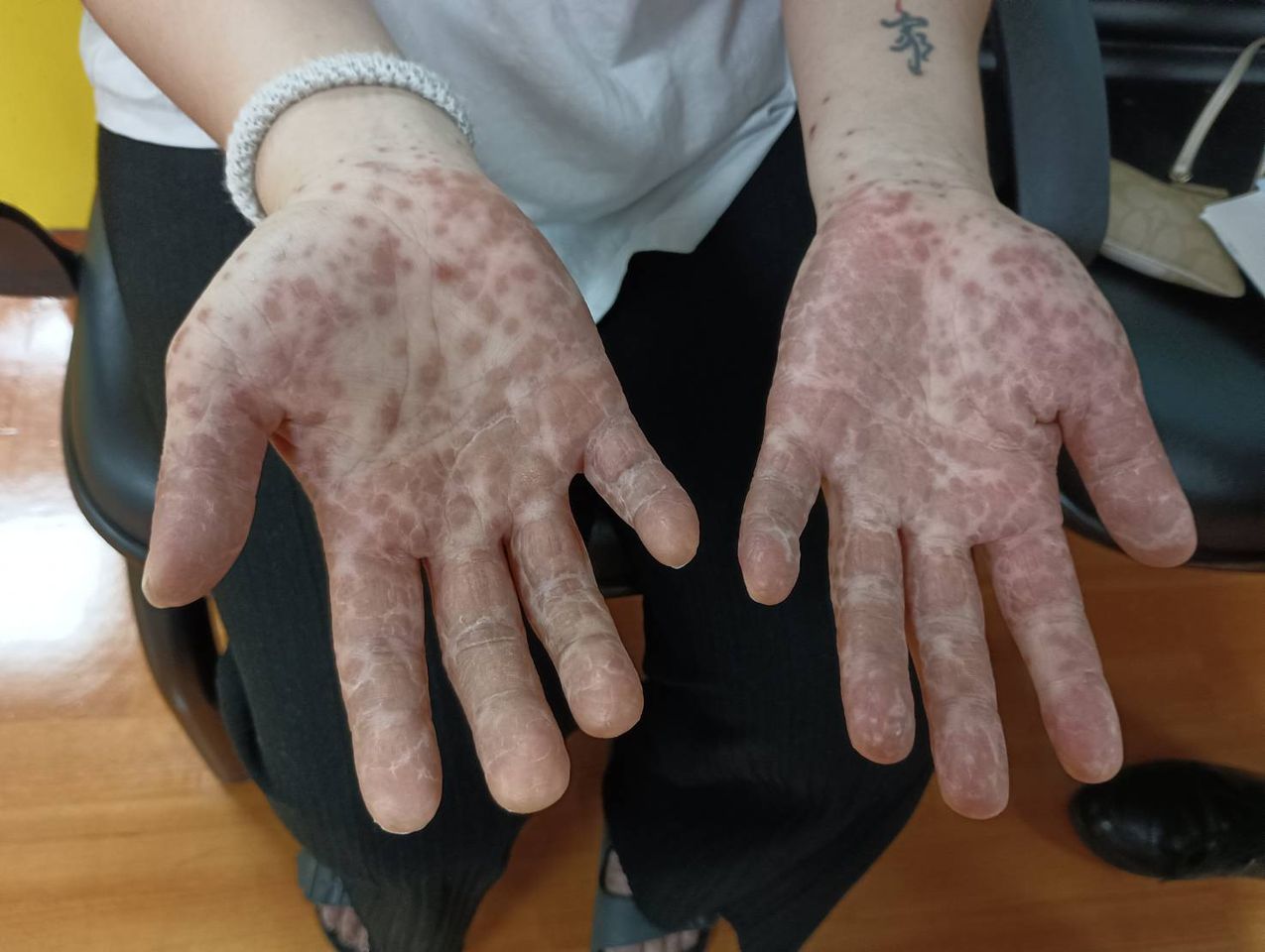 彰化1名27歲的蕭姓2寶媽因喉嚨痛,就診為咽喉炎,不料雙手及雙腳布滿密密麻麻的紅疹,怵目驚心,今(16日)被轉介到衛福部彰化醫院小兒科門診,確診為腸病毒。小兒科主任馬瑞杉指出,腸病毒至今還在大流行,不少幼兒園因而停課,不只孩童感染,連大人也無法倖免,也有併發重症的可能,不要輕忽。