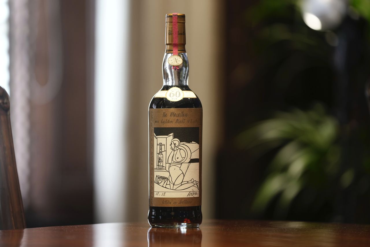 綜合衛報、法廣報導,這瓶蘇格蘭麥卡倫1926威士忌是在雪莉桶中陳釀60年後,於1986年裝瓶,全世界只有40瓶,是麥卡倫酒廠迄今年份最老的酒。其中12瓶貼上義大利藝術家阿達米(Valerio Adami)設計的酒標,這次拍賣的威士忌就是其中之一。