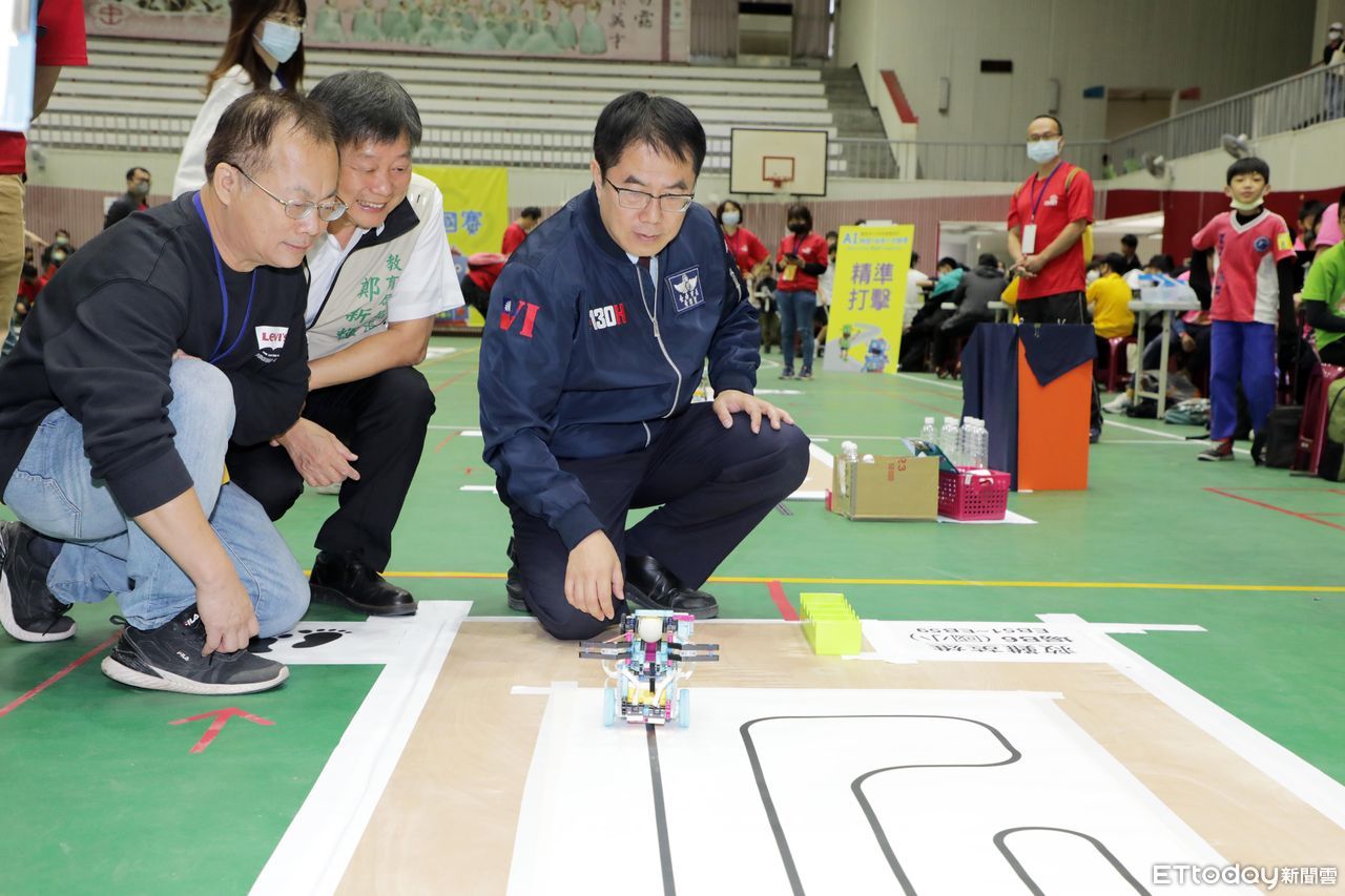 ▲「台南市AI機器人創意暨全國賽」19日在中山國中盛大展開,邀請市長黃偉哲致詞,親自體驗「救難英雄」、「精準打擊」、「智慧城市」等項目,為參賽學生加油打氣。(圖/記者林東良翻攝,下同)