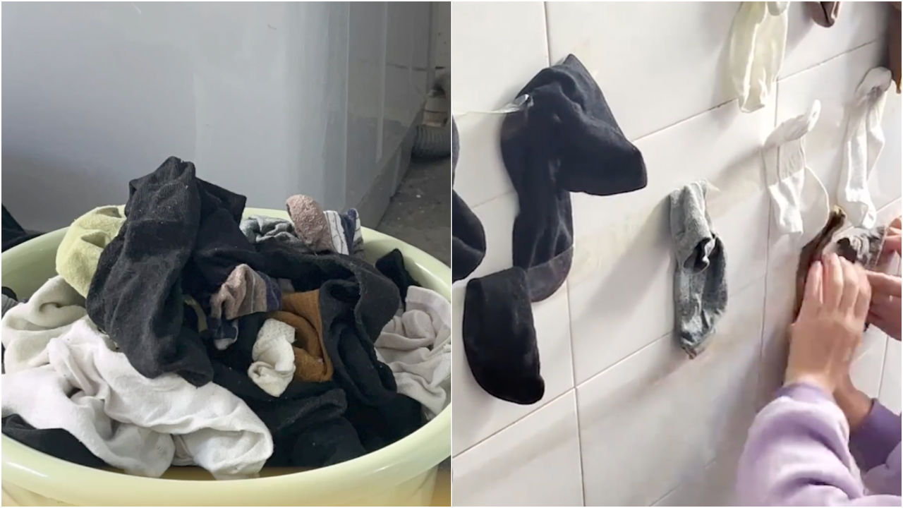 據《白鹿視頻》報導,劉姓女學生19日發布影片稱,發現有人使用公共洗衣機,「拼單式」洗了堆積半桶的襪子,她決定將洗衣機內的襪子,一雙雙用膠布貼在牆上以表憤怒。