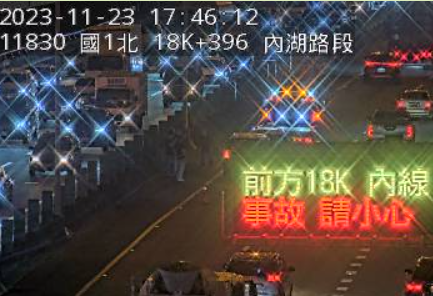 國道1號北向18公里處內湖路段今(23)日下午5時41分發生車禍!2輛自小客車追撞占用內線,警消獲報到場處理拖吊中,由於正值下班尖峰,導致路段回堵2公里,詳細肇因有待進一步釐清。請用路人小心行駛。