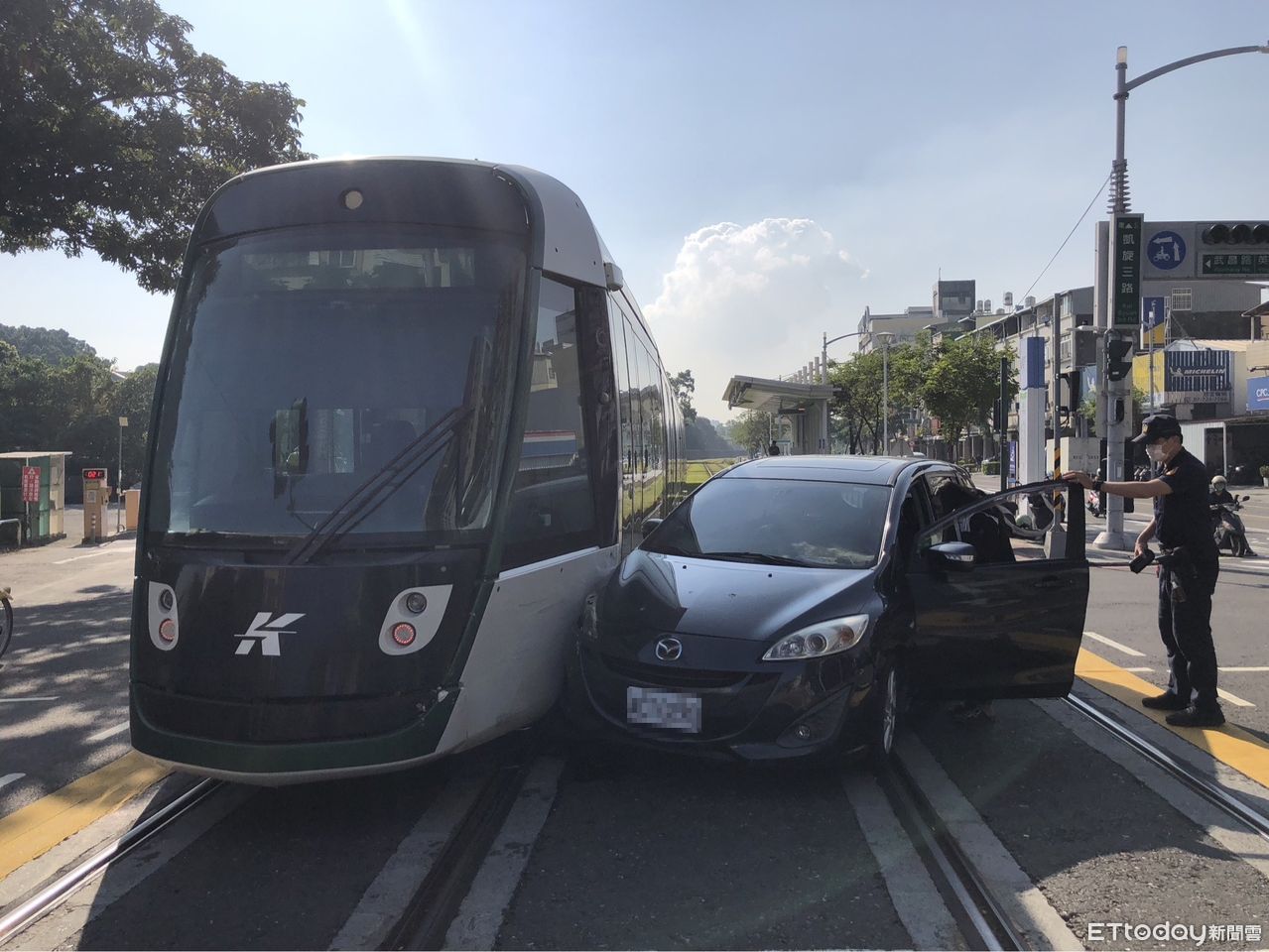 ▲轎車未依號誌燈行駛,與輕軌發生擦撞。(圖/記者吳世龍翻攝)