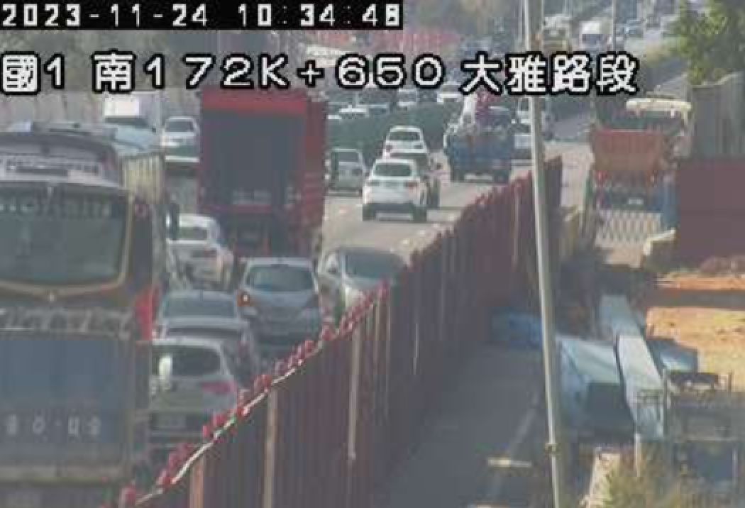 國道1號南下173公里處大雅路段今(24)日上午10時27分發生車禍!1輛大貨車、小客車追撞,占用外車道,警消獲報前往拖吊處理中,目前後方回堵1公里,詳細傷亡、肇事原因還有待後續釐清。請用路人小心行駛。