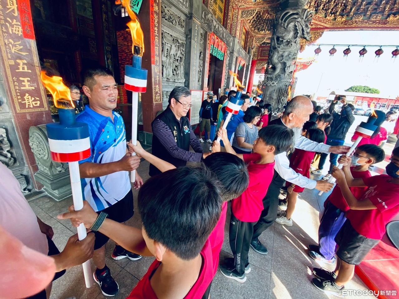 ▲台南市立土城國民小學24日,由李貞慧校長率領逾百位師生來到正統鹿耳門聖母廟,舉行「聖火傳遞祈福祭典」。(圖/記者林東良翻攝,下同)