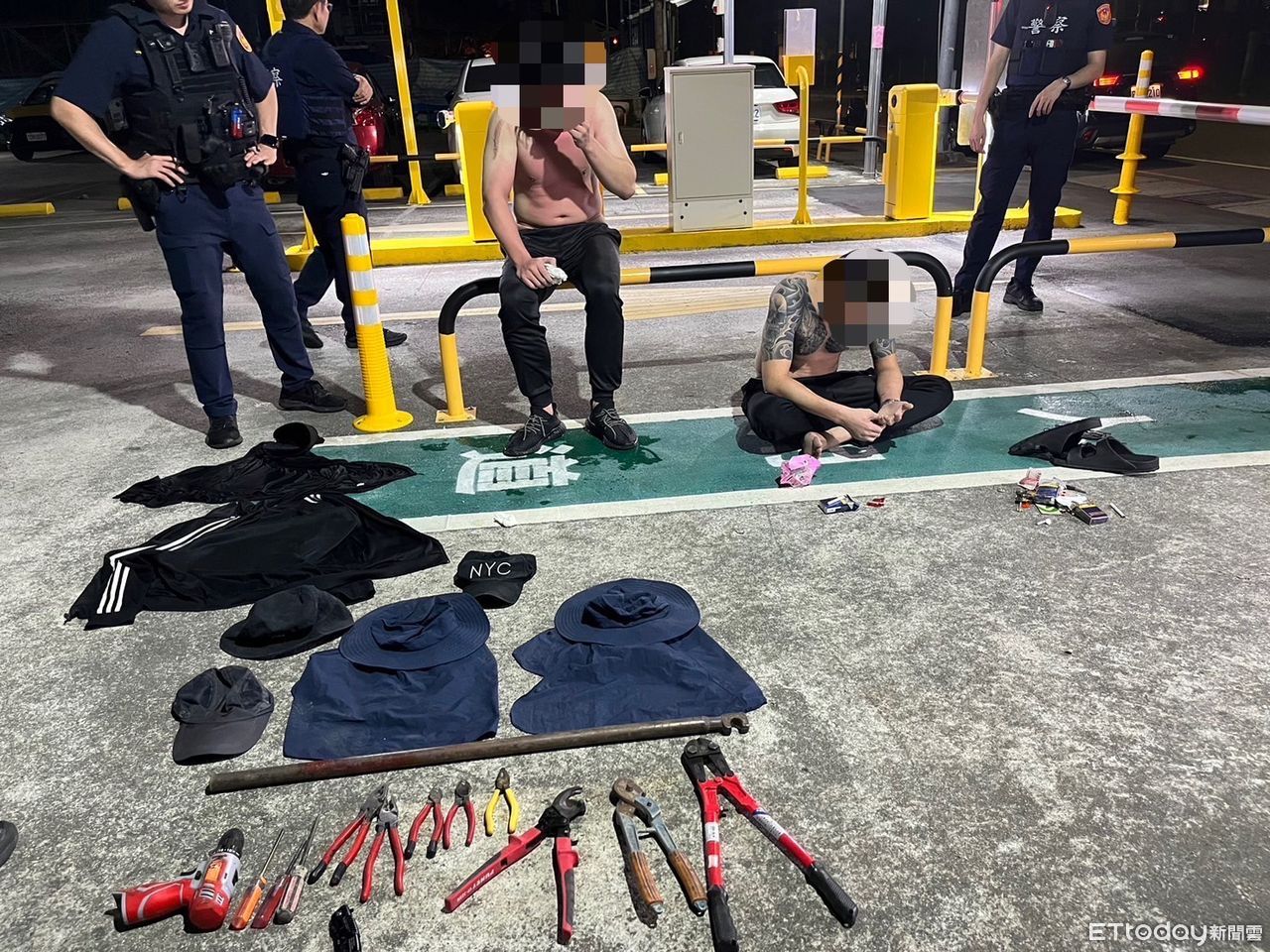 約過1小時,黃男在工地內搜刮一批工具,從工地圍籬爬出返回車上,施男則下車繳費,警員見狀,立即上前表明身分,除了搜出剛竊得工具一批外,還在車上發現毒品K他命及一粒眠,並在施男身上發現,8日在基隆竊得的手錶及戒指,以及其他竊案失物,警方立即將2人帶回偵辦。