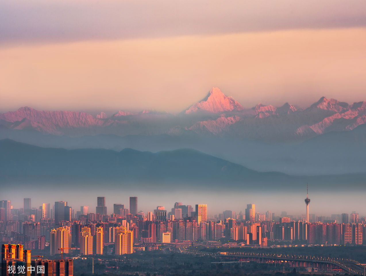 ▲成都樓房天際線與四姑娘山山景連成一片。(圖/CFP)