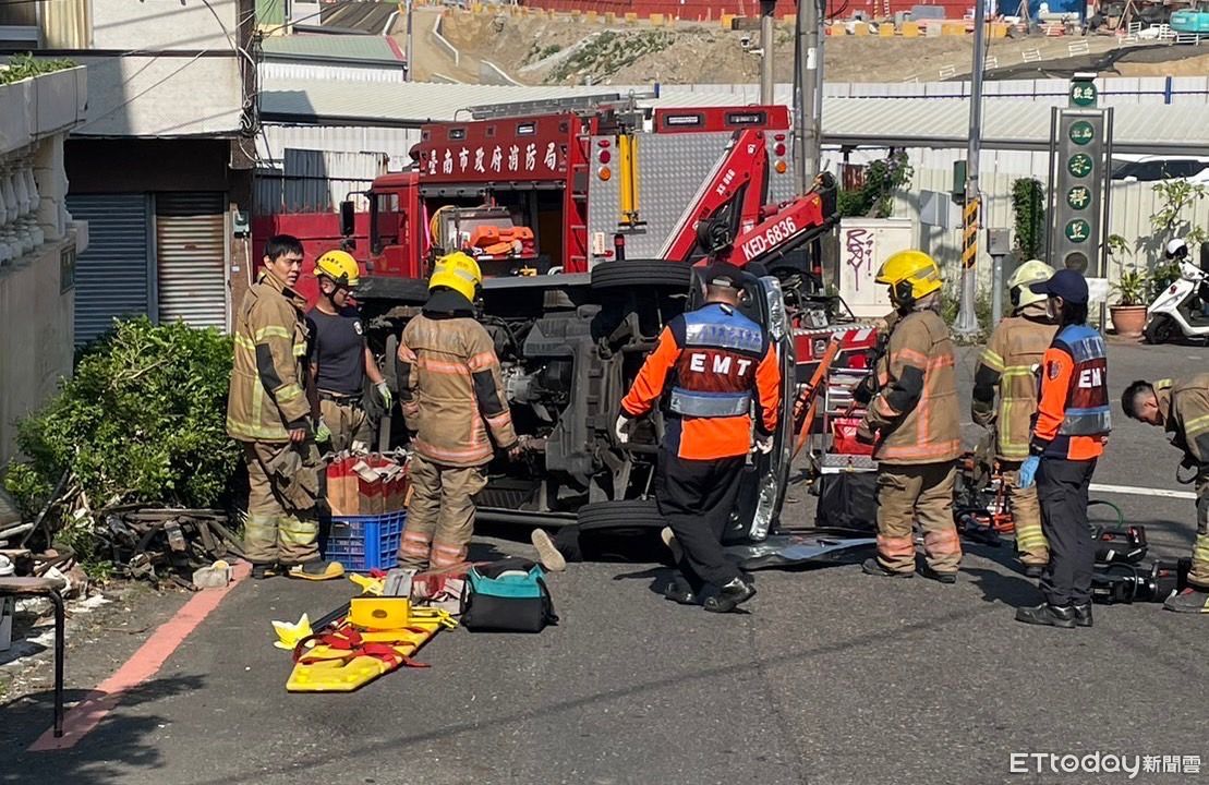 ▲台南北區實踐街26日上午11時許,發生一起廂型車翻覆事故,造成70歲方姓女子壓在車下方,送醫不治死亡,車上孫女未受傷。(圖/民眾提供,下同)