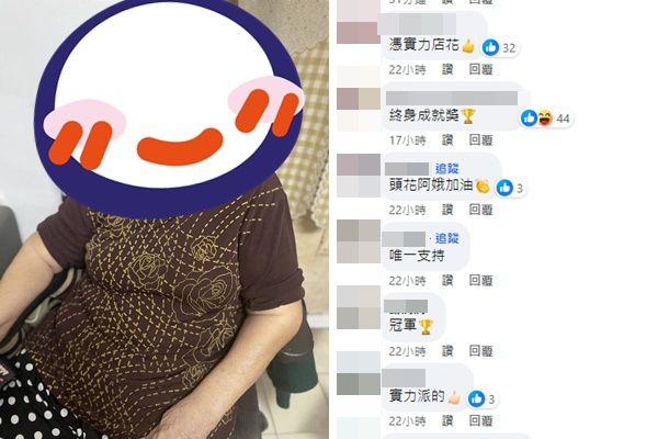沒想到,霸氣頭家嬤參戰後,人氣輾壓一票年輕男女,獲得超過1.2萬讚,大票網友留言洗版,高喊「憑實力店花」、「終身成就獎」、「頭花阿娥加油」、「資深美女」、「一定要給阿嬤一個讚」、「阿嬤第一名」、「我給滿分」、「冠軍出爐了」、「第一次看到全憑實力參戰的女生,第一次在這留言就獻給這美女了」、「這個我可以」。