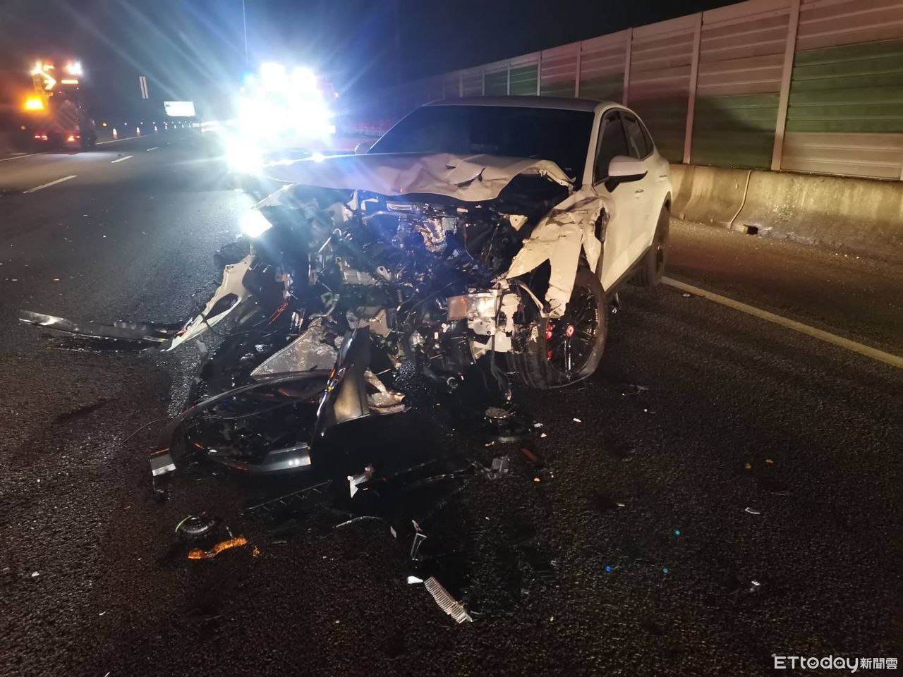 ▲國道一大雅段昨天深夜發生一起車禍,一輛奧迪休旅車開輔助駕駛,不明原因追撞緩撞車。(圖/民眾提供)