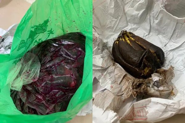 她等了8天終於收到包裹,但香蕉、火龍果、橘子全都發霉,散發出酸臭味,食物的汁液也流出來,「火龍果變成一袋酸臭的火龍果汁,包裝在箱子裡的袋子還被撞破,流到我的衣服上」,以往都沒有遇過這種事情,收到包裹時超傻眼。