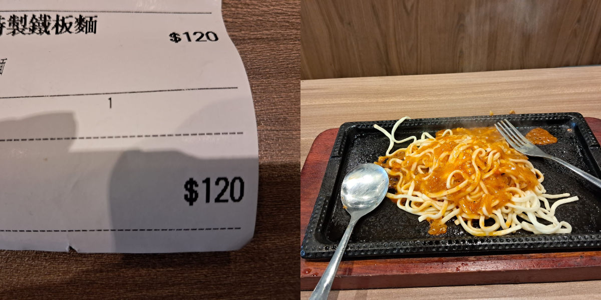 一名男網友在臉書《爆廢1公社》貼出兩張照片,分別為120元的點餐單據,以及蘑菇醬鐵板麵,原PO還特別點了免費加麵的服務,豈料份量卻讓他大失所望。