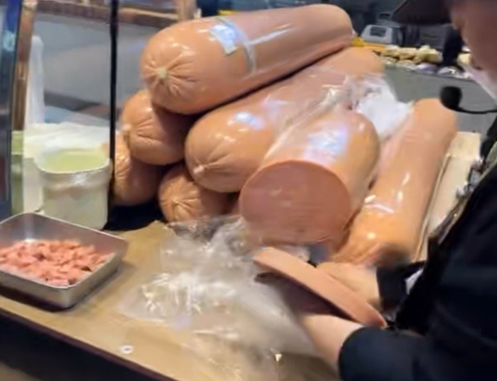 畫面中可見,不少巨大的熱狗整齊地擺放在架上,立起來的長度高於普通孩童不少,大小對比後方的吐司大出許多倍。如此巨大的熱狗,也有網友幫大家解釋價格,「賣的是散裝,你比劃他切然後按斤稱,一段一段賣,9.9元一斤(人民幣,約台幣44元),不是一整根賣。」