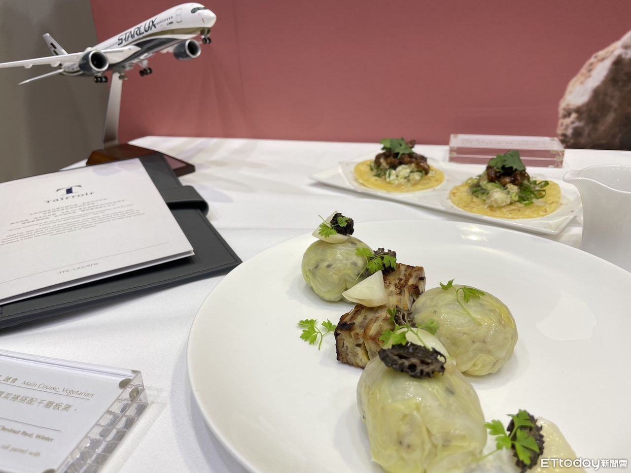 星宇航空今日正式宣布頭等艙新菜色與米其林三星餐廳Tairroir 攜手合作,推出5道精緻美饌,將於12月16日開航的台北飛往舊金山航班搶先登場,明年起台北出發洛杉磯的航班也可品嚐到。而蔬食主菜「星昂栗宇」於台北出發新加坡的頭等艙上亦可享用得到。
