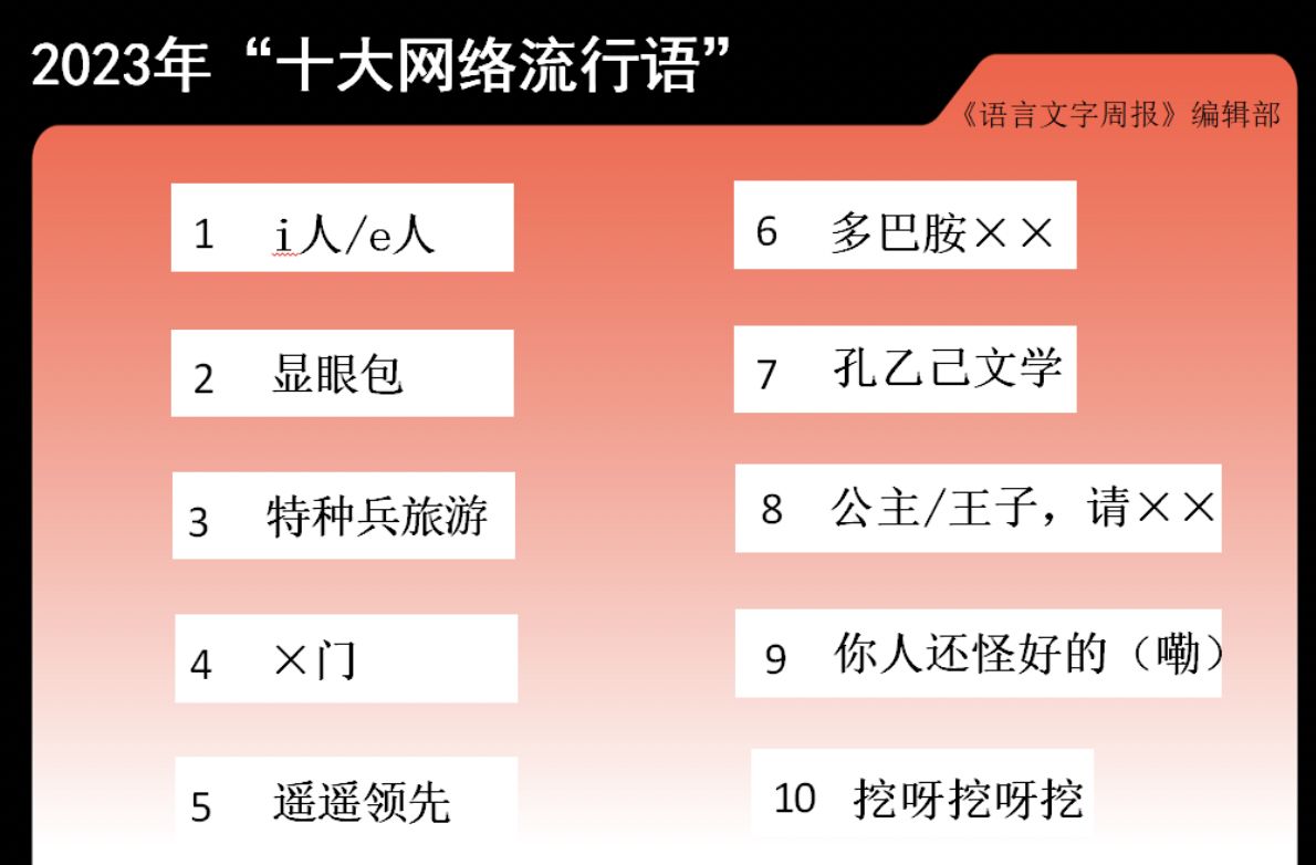 據《澎湃新聞》報導,由大陸《語言文字周報》主辦的2023「十大網路流行語」8日公布結果,按排名先後順序分別是,「i人/e人」、「顯眼包」、「特種兵旅遊」、「X門」、「遙遙領先」、「多巴胺××」、「孔乙己文學」、「公主/王子,請××」、「你人還怪好的嘞」、「挖呀挖呀挖」。