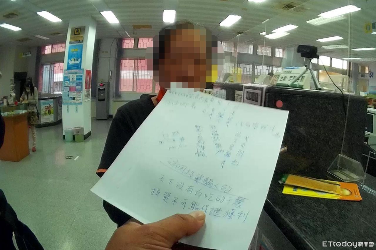 ▲喑啞婦人陷網戀投資詐騙,中寮分駐所副所長何秉緣以紙筆溝通阻詐。(圖/記者高堂堯翻攝,下同)