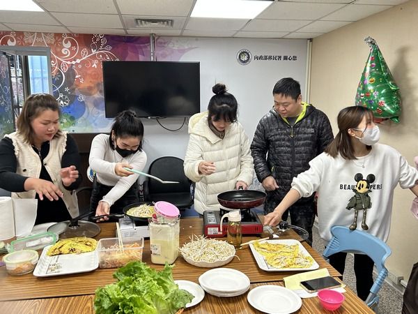 聖誕節前夕,移民署桃園市服務站宣導防範非洲豬瘟及反賄選,舉辦新住民家庭教育暨法令課程,邀請越南新住民阮玉鶯分享跨國婚姻家庭的經營秘訣,並帶領學員手作越南版蚵仔煎「越南煎餅」。桃園市服務站主任黃英貴表示,2024 1月13日總統、立委大選即將到來,呼籲新住民朋友把握手中神聖的一票,勇敢檢舉賄選拿獎金。