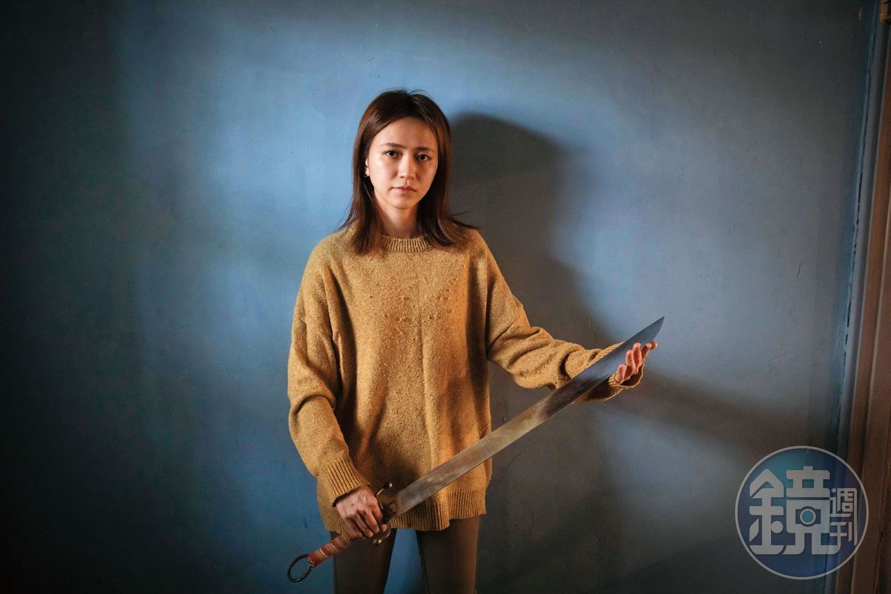 ▲王瀞韓兒時的偶像是楊紫瓊,一直希望成為武術家。台灣#MeToo爆發後半年,她帶我們回台南老家,翻找她失落的武術夢。圖為她手持武術南刀。