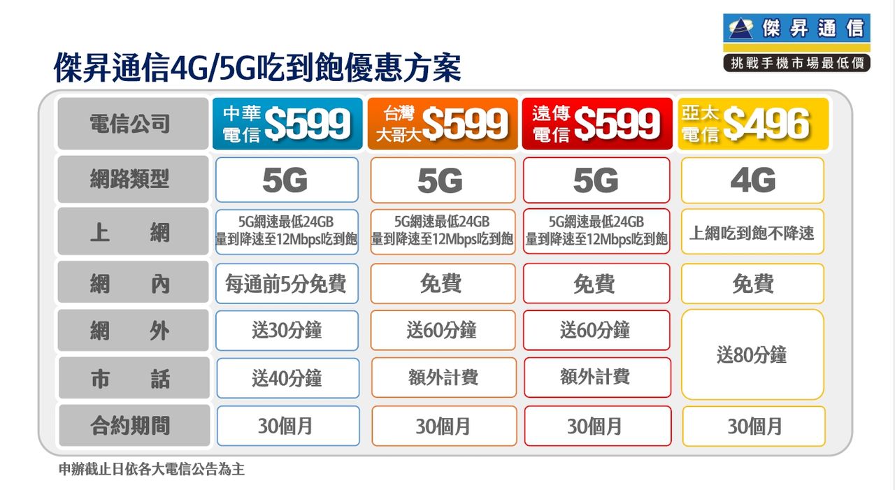 ▲4G、5G吃到飽優惠方案。(圖/傑昇通信。可點圖放大)