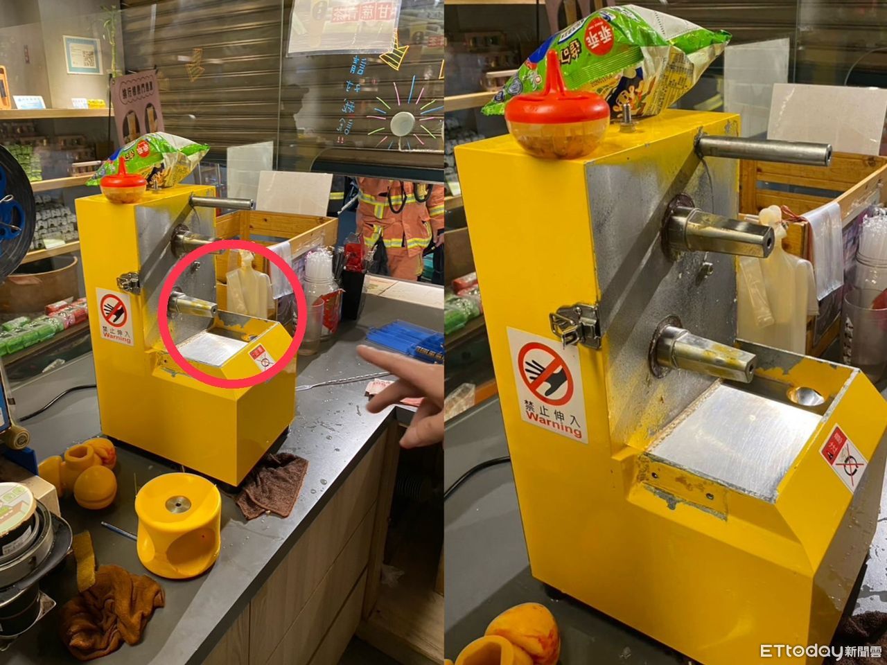 ▲員工的大拇指捲入榨果汁機,差點斷肢 。(圖/記者戴上容翻攝,下同)