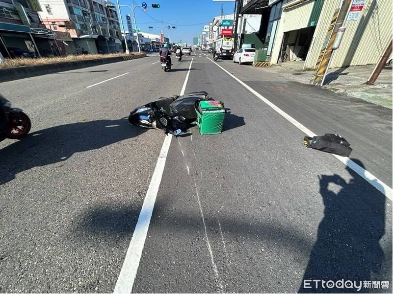 ▲台南1部自小客車擦撞同向行駛的外送員機車倒地,後方駛來的機車閃避不及也撞上,2名騎士受傷。(圖/記者林東良翻攝,下同)