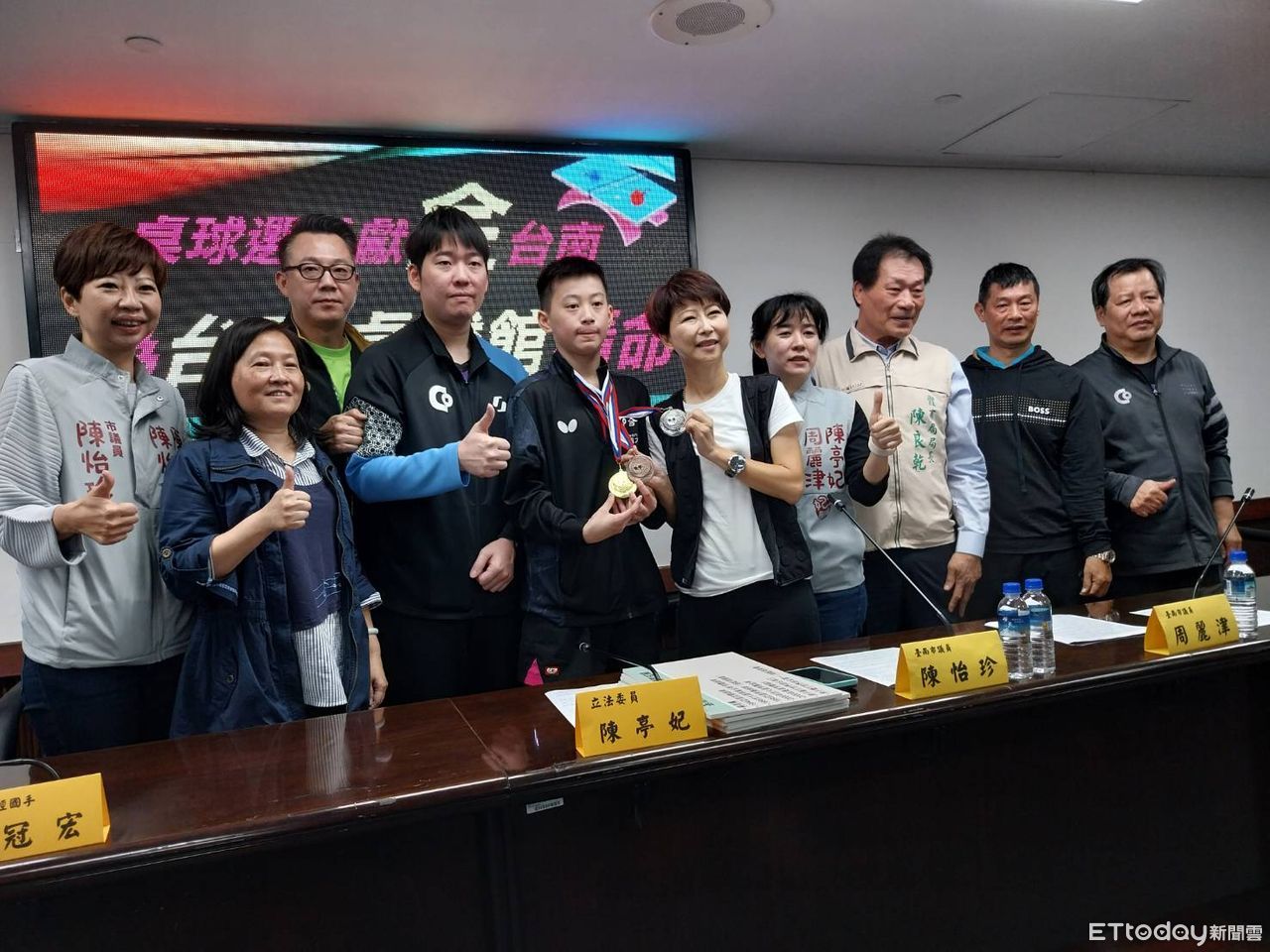 立委陳亭妃14日召開桌球選手獻「金」台南,為台南桌球館請命記者會,邀請市府體育局長陳良乾、體育署運動競技組科長周德倫、運動設施組組長蔡文娟、蔣澎龍教練、黃聖盛教練、台南市桌委會副主委吳文嘉及獲2023年世界盃青少年U15桌球錦標賽男雙金牌、男團銀牌、混雙銅牌的史上最年輕國手郭冠宏等單位與會。