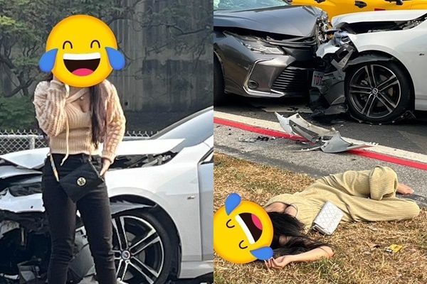 網友在臉書社團「重機車友 ❘ 各區路況天氣、資訊分享中心」轉發照片,從畫面中可見,一輛白色轎車逆向撞上黑色轎車,其中一位女駕駛正講著電話,而另一名女駕駛則躺在草地上;不過重點是,兩位都擁有火辣身材,胸前「巨大車頭燈」更奪走全部焦點。