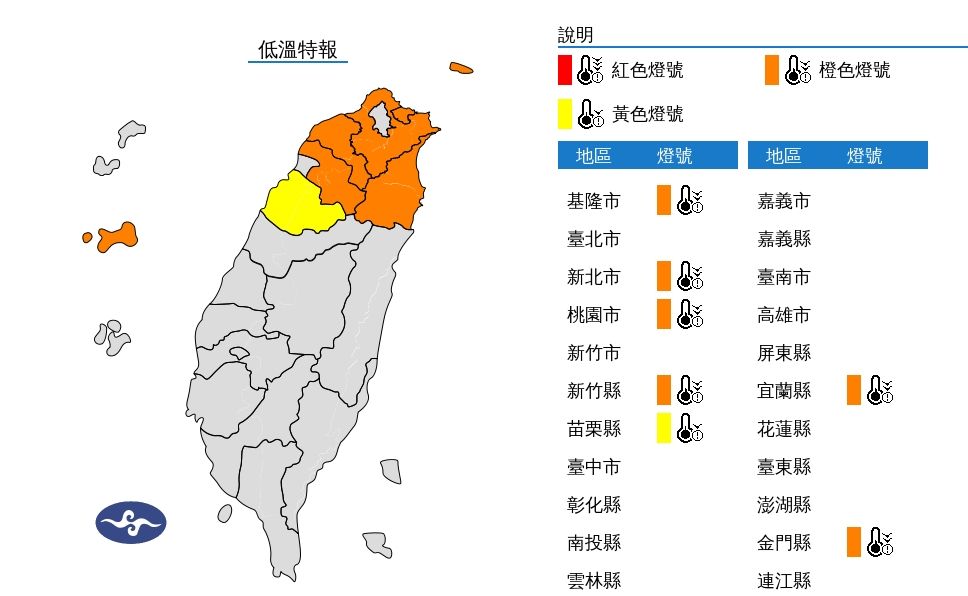 橙色燈號(非常寒冷):新北市、基隆市、桃園市、新竹縣、宜蘭縣、金門縣