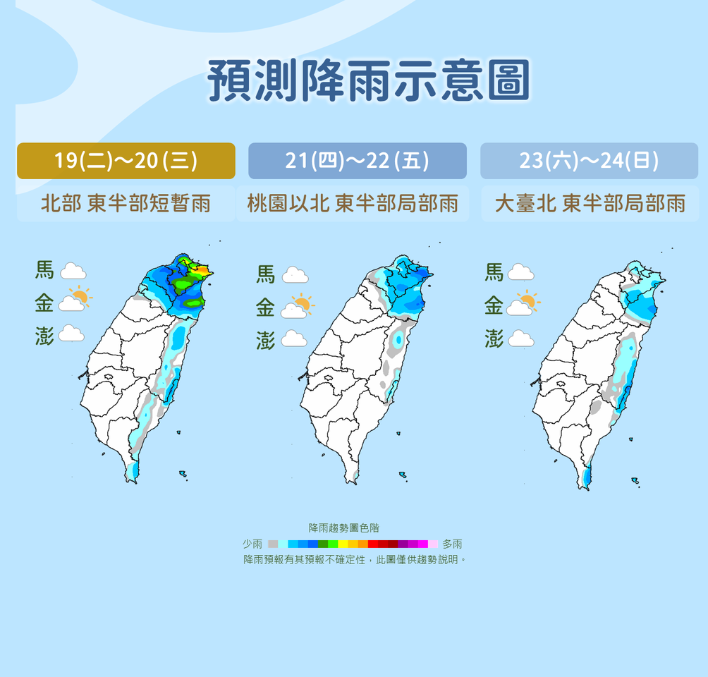 明日強烈冷氣團南下,且水氣偏多,明後兩天北部、東部有短暫雨,基隆北海岸雨勢較為明顯。明日迎風面北部稍微降溫,周三開始各地明顯轉冷,北台灣低於14度。