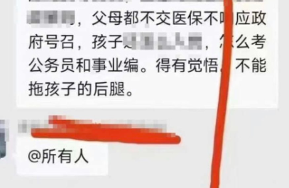 「劉某某」還說:「雖然是自願交醫保…父母都不交醫保,孩子還怎麼考公務員和事業編,不能拖孩子的後腿,以後你孩子考上老師、考上醫生、考上事業編和公務員了,筆試面試分都過了,最後臨門一腳政審沒過,不要後悔終身。」