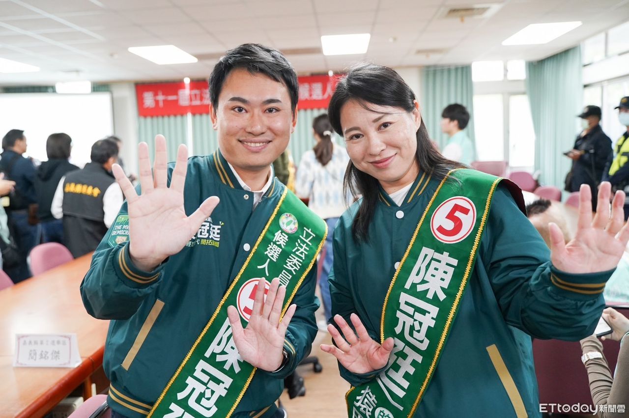 ▲民進黨嘉義縣立委參選人陳冠廷(圖左)由妻子猿田千里陪同抽到5號 。(圖/記者翁伊森翻攝)