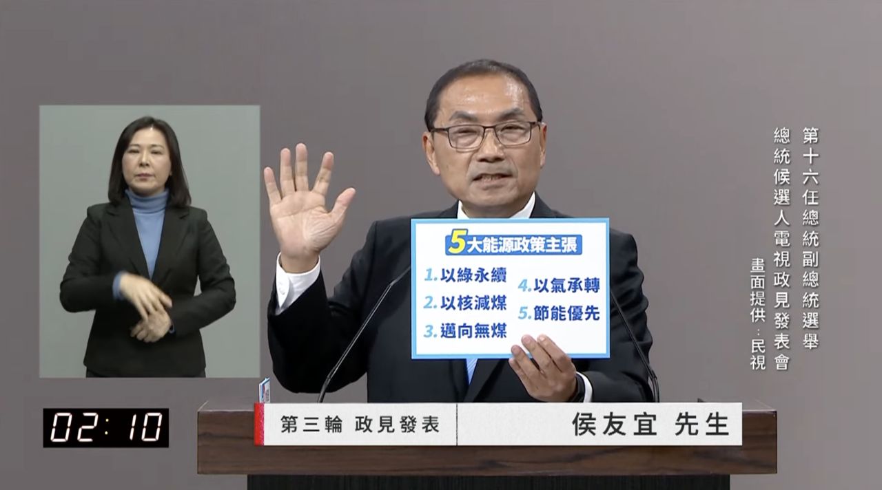 侯友宜在第三輪發言時指出,綠能發電,綠能發財,其中弊案有很大問題,尤其賴清德所屬的新潮流派系。他說,「非核家園」是民進黨的政策,能源政策說是五三二,但都沒有做到,排碳政策也跟全球背道而馳。