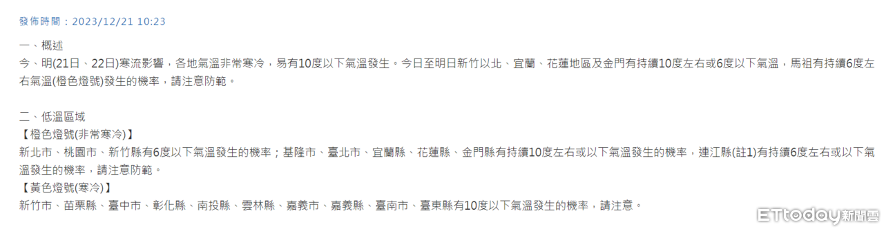 交通部中央氣象署今(21日)上午10時23分發布低溫特報:「今、明(21日、22日)寒流影響,各地氣溫非常寒冷,易有10度以下氣溫發生。今日至明日新竹以北、宜蘭、花蓮地區及金門有持續10度左右或6度以下氣溫,馬祖有持續6度左右氣溫(橙色燈號)發生的機率,請注意防範。」